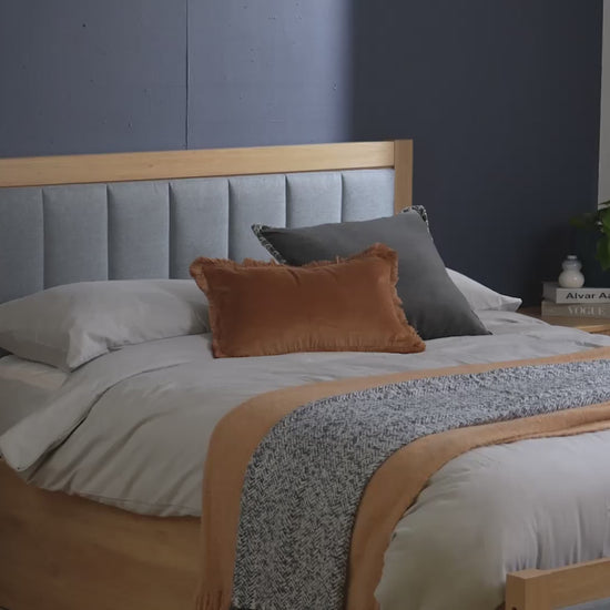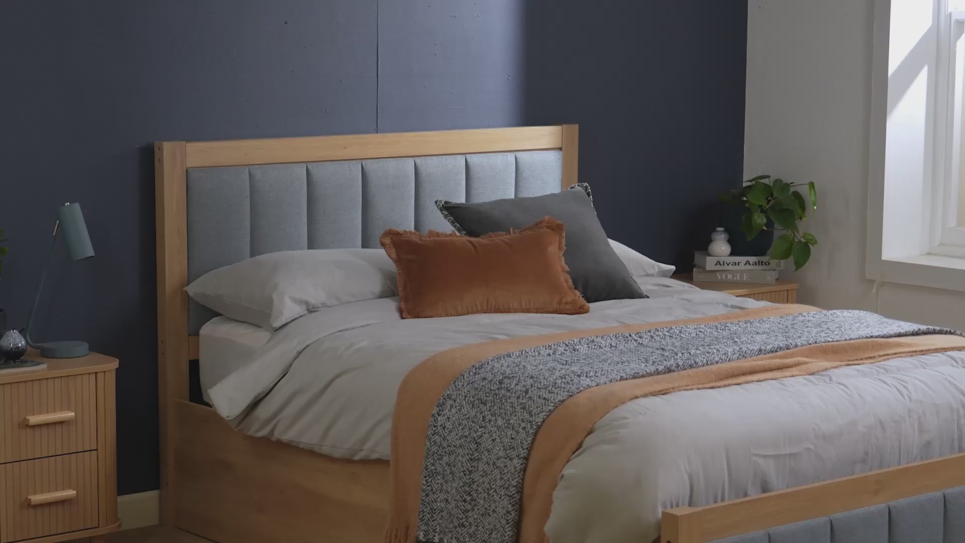 Upgrade your bedroom with the Belmont Ottoman Bed, a premium storage bed that combines modern design, practical functionality, and exceptional comfort. Featuring a warm oak-effect frame and a soft grey-blue fabric headboard and footboard, this ottoman bed adds a sophisticated and contemporary touch to any interior.